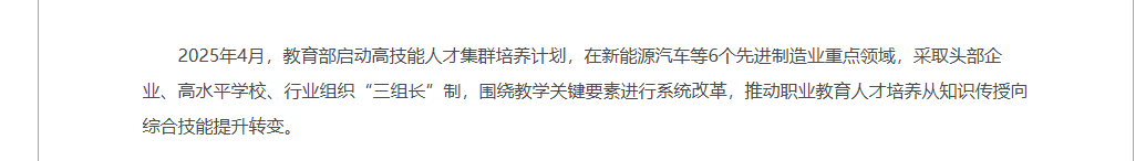 近日,教育部推进实施“高技强人才集群培育打算”,做为教育强国扶植分析试点的首批沉点项目之一,此次培育打算次要聚焦高档数控机床取机械人等六个先辈制制业沉点范畴,定向培育具备“手艺精、能立异、适配财产需求”的复合型高技强人才。