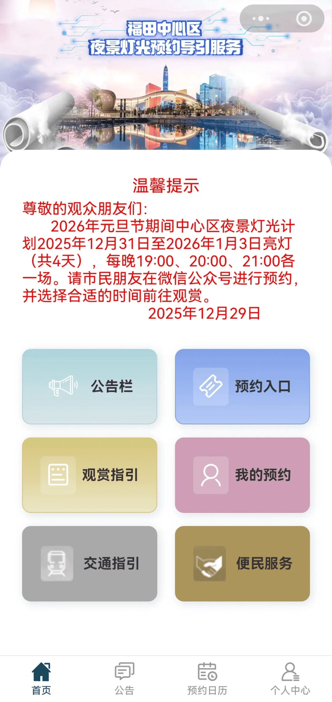●2026年除夕节期间福田核心区夜景灯光打算2025年12月31日至2026年1月3日亮灯(共4天),每天19!00、20!00、21!00各一场。