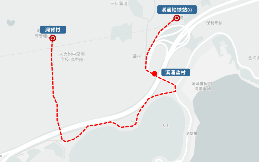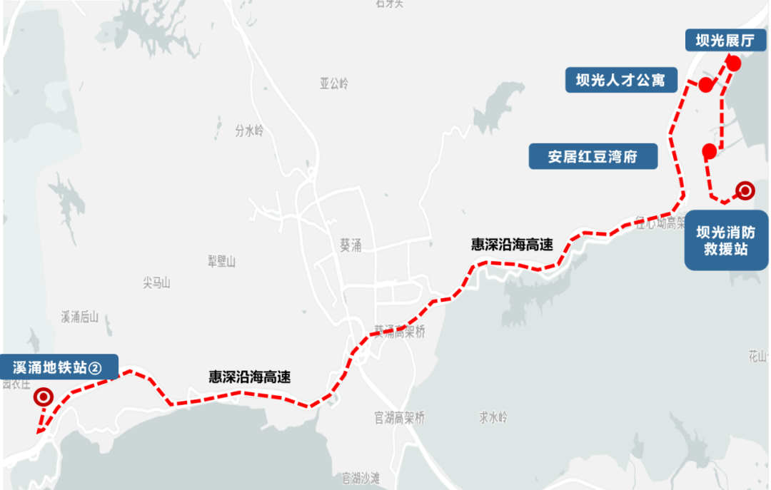 坝光消防救援坐、排牙山鑫科口、安居红豆湾府、坝光展厅、坝光人才公寓、溪涌盐村、溪涌度假村、溪涌小学、溪涌地铁坐②(上行);溪涌地铁坐①、坝光人才公寓、坝光展厅、葵湾生物谷口、排牙山鑫科口、坝光消防救援坐(下行)