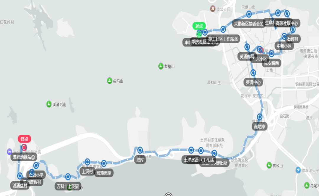新大公交总坐、上下横岗、南澳核心①、上下企沙、南澳处事处、水头海鲜街、中国农科院深圳基因组所、布新社区、大鹏新区妇长保健院、大鹏核心①、送宾北西、溪涌盐村、溪涌度假村、溪涌小学、送宾北西、大鹏核心①、王母围、大鹏新区妇长保健院、布新社区、中国农科院深圳基因组所、水头海鲜街、南澳处事处、上下企沙、南澳月亮湾、上下横岗、新大公交总坐(下行)