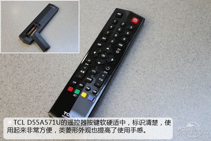 TCL D55A571U的遥控器也是保守的按键式,反面采用滑腻概况,背后具有磨砂质感,整个遥控器类菱外形,由两节7号电池供电,采用红外遥控的体例。
